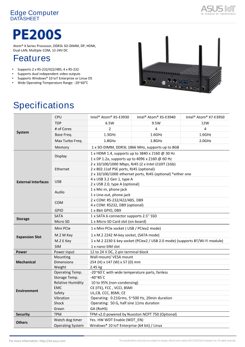 ASUS PE200Sは、AIoTコンピューティング向けの高品質でTCOに最適化されたソリューションを備えたインテリジェントエッジコンピューターです。最大6つのCOMポート(2 x RS-232/422/485)を搭載し、複数のインターフェイス(HDMI...