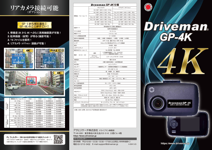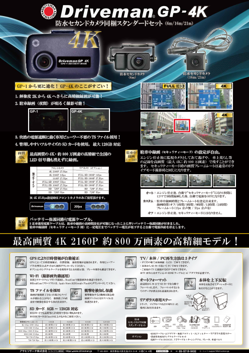 駐車中録画機能を搭載しており、エンジン停止後に監視カメラとして あて逃げや、 車上荒らし等の記録を高画質で残すことが可能。 【特長】 ■高画質の4K・約 800万画素の高精細録画 ■駐車中録画(セキュリティーモード)の設定が自由 ...