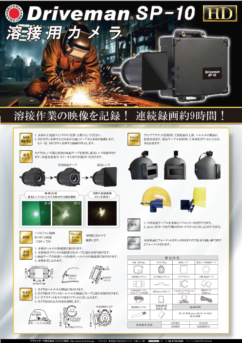 カメラのレンズ部に遮光レンズを貼り付け作業状況を録画できます。 ※遮光度番号 #5 ~ #13までお選びいただけます。 【取付】 強力な両面テープでヘルメット又は溶接面に取り付けできます。 クリップブラケットを使用すればヘルメット側面、溶接面...