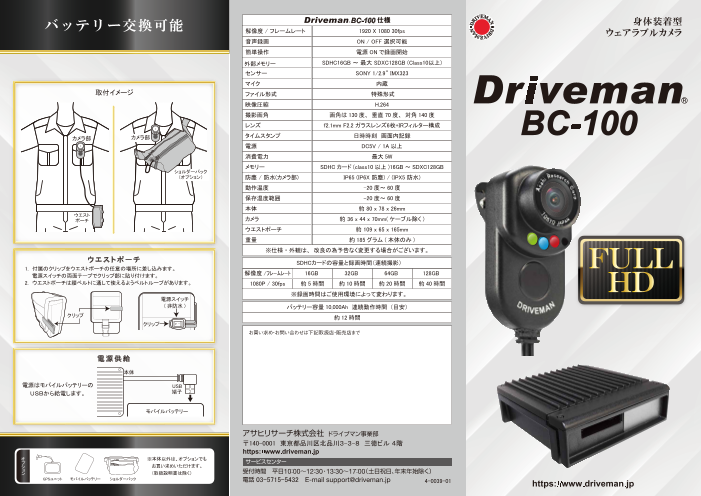 本体上部の電源/録画ボタンを押すだけで録画を開始、フル充電で 約8時間連続撮影が可能。 また、フロント部分に名前入りステッカーを貼り付け可能で、役職や お名前などが変わっても張り替える事ができ、1枚から作成可能です。 【特長】 ■ボタン...