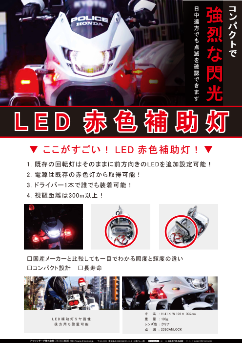 コンパクトで強烈な閃光!日中遠方でも点滅を確認可能 LED赤色補助灯 当製品は既存の回転灯はそのままに、前方向きのLEDを追加設定できる LED赤色補助灯です。 電源は既存の赤色灯から取得でき、ドライバー1本で誰でも装着可能。 視認距...