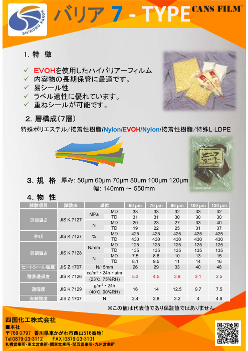 ■製品概要 バリア7は7層のフィルムで構成されています。EVOH樹脂とNY樹脂の特性を利用し、バリア性と高強度を実現しました。 酸化しやすい食品の包装や、ガス置換包装などの高い酸素バリア性が必要な用途に最適です。 最内層に低融点のL-LDPE...