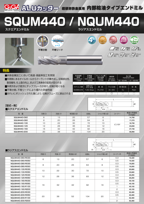 超硬非鉄金属用 内部給油タイプのスクエア・ラジアスエンドミル