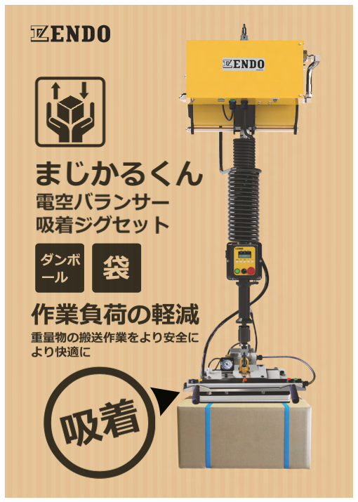 ■特長 ・PPバンドで囲った段ボール梱包も吸着可能です。 ・持ち手の無いワーク搬送に最適です。 ・重量物搬送における身体的負担を軽減し、労働災害防止に貢献します。 ・~30kgまでの段ボールに対応します。 ※可搬重量はワークの条件により異なりま...