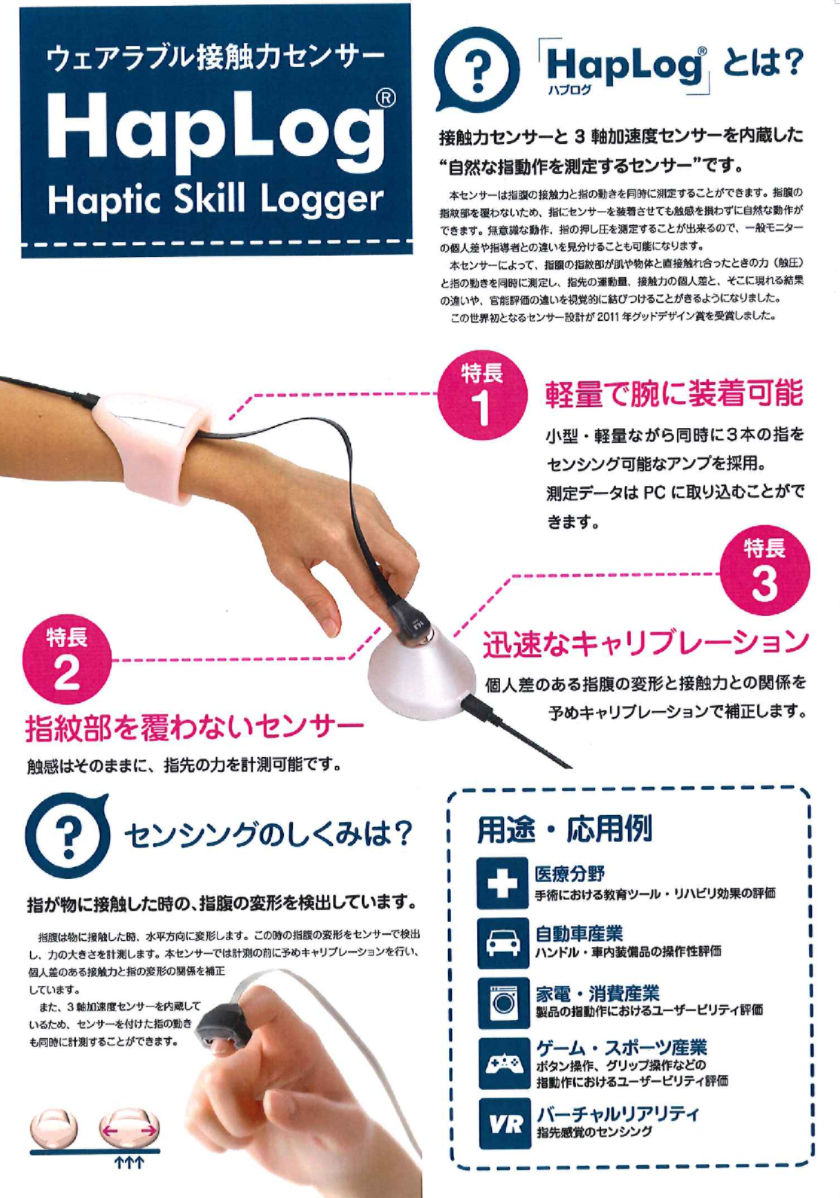HapLogとは接触力センサーと3軸加速度センサーを内蔵した自然な指動作を測定するセンサーです。 特長 1 軽量で腕に装着可能 2 指紋部を覆わないセンサー 3 迅速なキャリブレーション