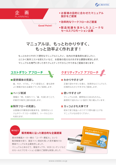 もっとわかりやすくて便利なマニュアルにしたい、社内の作業負荷を減らしたい、とにかく制作コストを抑えたいなど、お客様の抱えるさまざまな課題を解決します。マニュアルを専門に作ってきたクレステックだからこそできるご提案があります。 ◆詳細はカ...