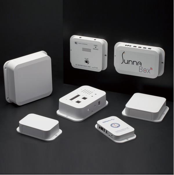 壁付用フランジ足付でフラットなデザインのプラスチックケース、IoT通信機器・センサー...