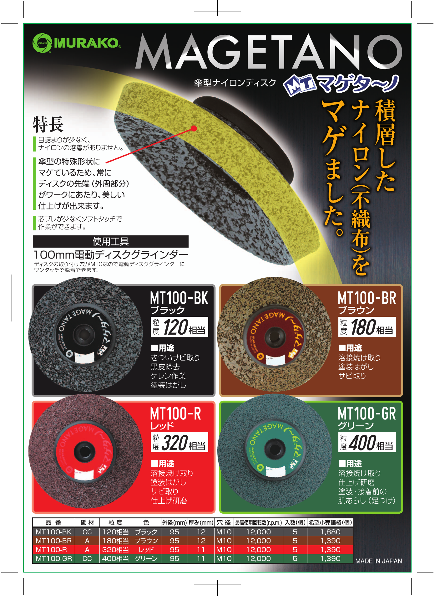 傘型の特殊形状でそれぞれの特徴がさらに活き、いつも以上に美しい仕上げが可能になりました。 ・MT100-BK ブラック #120相当 用途:黒皮除去 ・MT100-BR ブラウン #180相当 用途:塗装剥がし ・MT100-R レッド #...