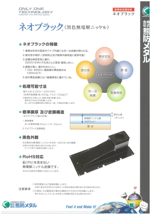 膜厚均一性に優れる黒色の無電解ニッケルめっきです。 紫外線による退色(色褪せ)が無く、紫外線周辺の部品にも使用できます。
