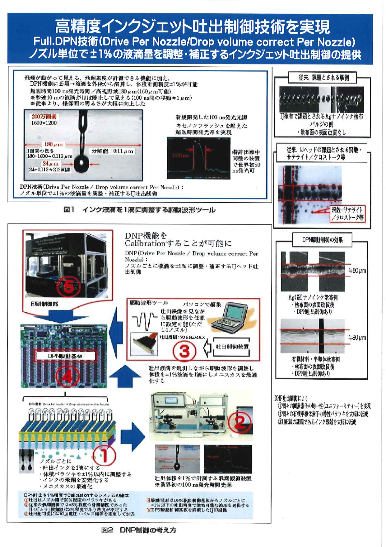 【特徴】 ○液滴の体積バラツキを解消 ○自社開発の高精度インク飛翔観測装置により 吐出インク体積の±1%精度での計測を実現 ○DNP精密吐出制御技術により、インクジェットヘッドの吐出量を ノズル毎に校正、多くの課題に対応します