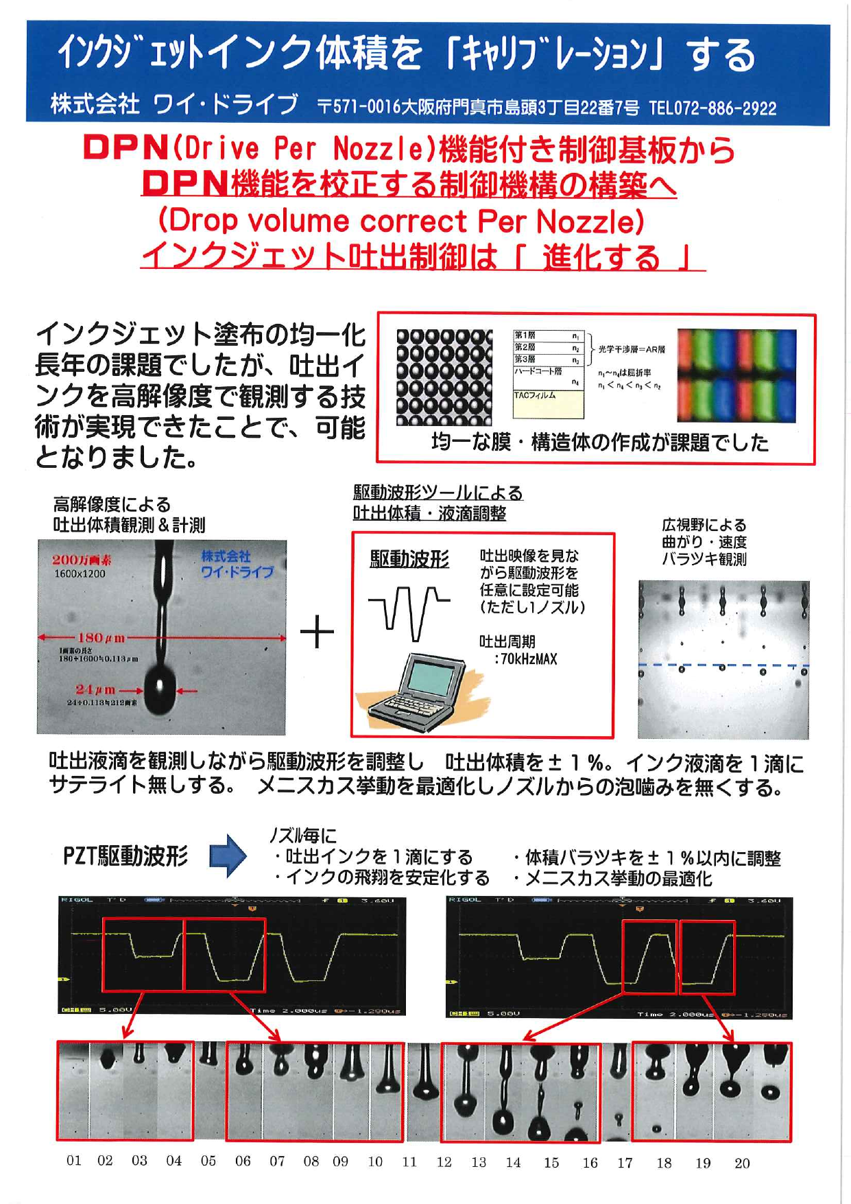 インクジェット工法に向けた主要技術/高解像度インク飛翔観測技術 飛翔が曲がって見える、飛翔速度が計測できる、それだけの機能ではありません DPN機能に必須 ⇒ 液滴を外径から演算し、体積計測精度±1%が可能 DPN制御に限らず、ノズル毎マル...