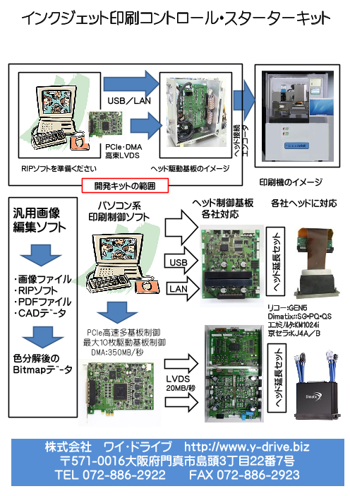 インクジェト印刷コントロール・スターターキットでは、各社インクジェットヘッドに対応するインクジェット印刷機開発に必要な インクジェットヘッド駆動AMP/パソコンからの印刷制御ソフト/パソコンとヘッド駆動AMPの通信制御をセットにして販売します。 御社...