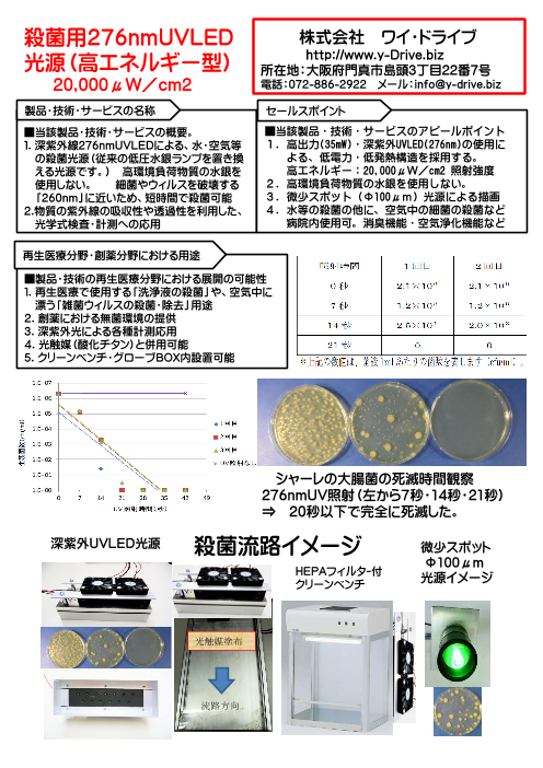 ■当該製品・技術・サービスの概要。 1.深紫外線276nmUVLEDによる、水・空気等の殺菌光源 (従来の低圧水銀ランプを置き換える光源です。) 高環境負荷物質の水銀を使用しない。細菌やウィルスを破壊する 「260nm」に近いため、短時...