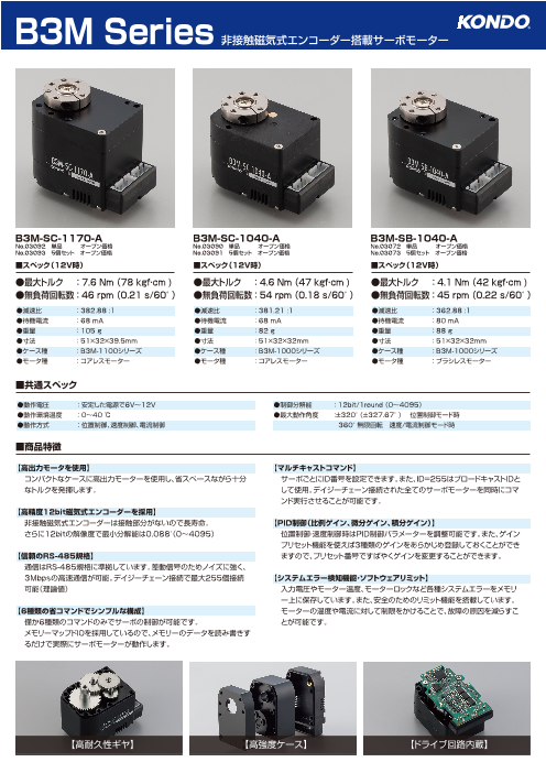 二足歩行ロボット競技会や学校関係、企業など幅広い分野で人気のあるKRSシリーズの製品チラシです。シリアル通信によるコマンドの送受信で手軽に角度制御が行えます。このチラシでは、代表的な商品のスペックと制御方法を3パターンご紹介しています。製品の詳細は、弊社...