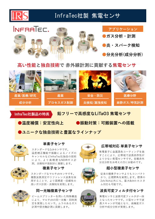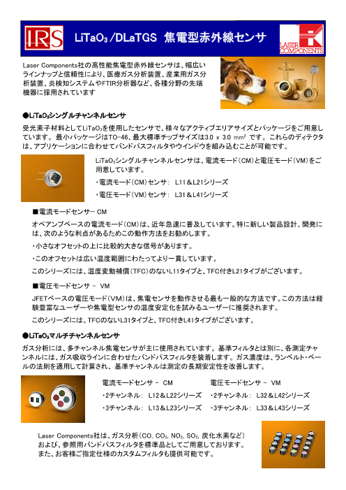 【製品の特長】 ●LiTaO3シングルチャンネルセンサ 受光素子材料としてLiTaO3を使用したセンサで、様々なアクティブエリアサイズとパッケージをご用意しています。 最小パッケージはTO-46、最大標準チップサイズは3.0 x 3.0 mm2 です...