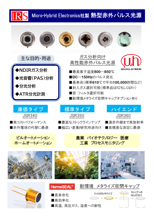 ●ガス分析向け高性能赤外パルス光源 ■最高素子温度800~850℃ ■DC~150Hzのパルス発光 ■長寿命(標準610℃で平均100,000時間など) ■封入ガス選択可能(標準品はN2もしくはKr) ■窓・フィルタ選択可能 ■耐環境メタライ...