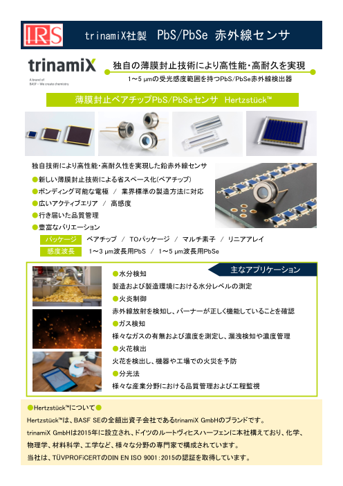 【製品の特徴】 ●新しい封止技術を採用したベアチップHertzstück™ - 新しい薄膜封止技術により、省スペース化(ベアチップ) - センサアセンブリの自動化(ワイヤボンディング可能) - 1〜5 μmのスペクトル範囲を持つPbS/PbSe赤...