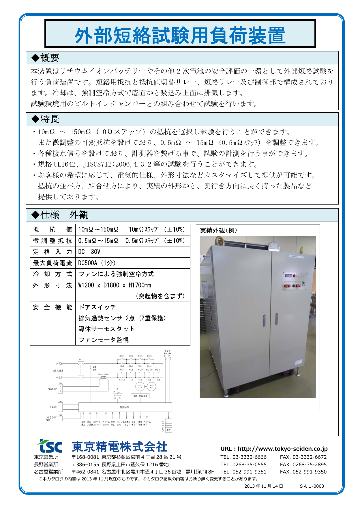 リチウムイオンバッテリーやその他2次電池の安全評価の一環として外部短絡試験を行う負荷装置です。