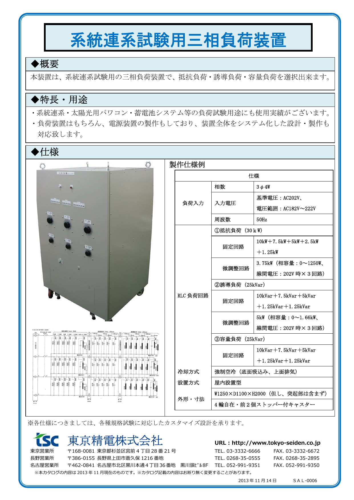 系統連系試験用の三相負荷装置で、抵抗負荷・誘導負荷・容量負荷を選択出来ます。