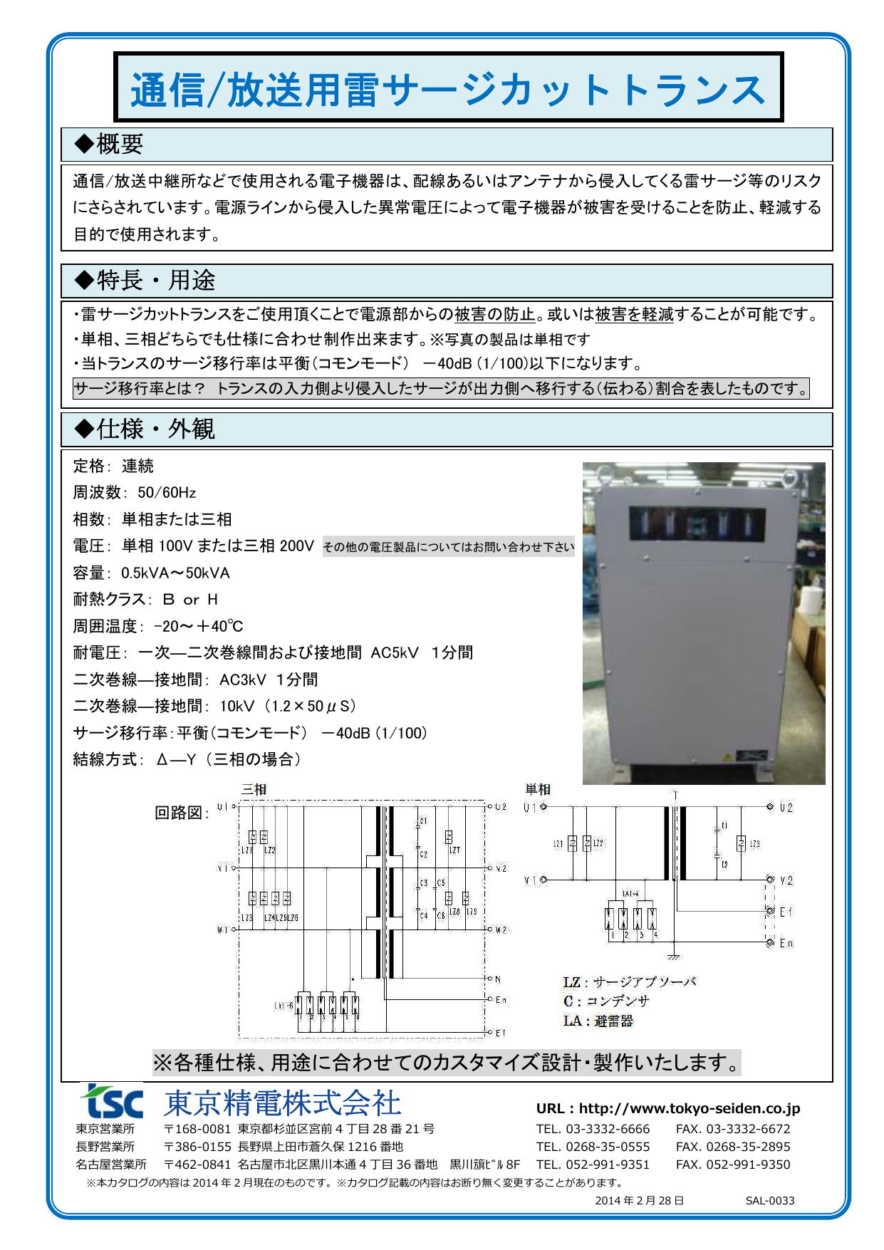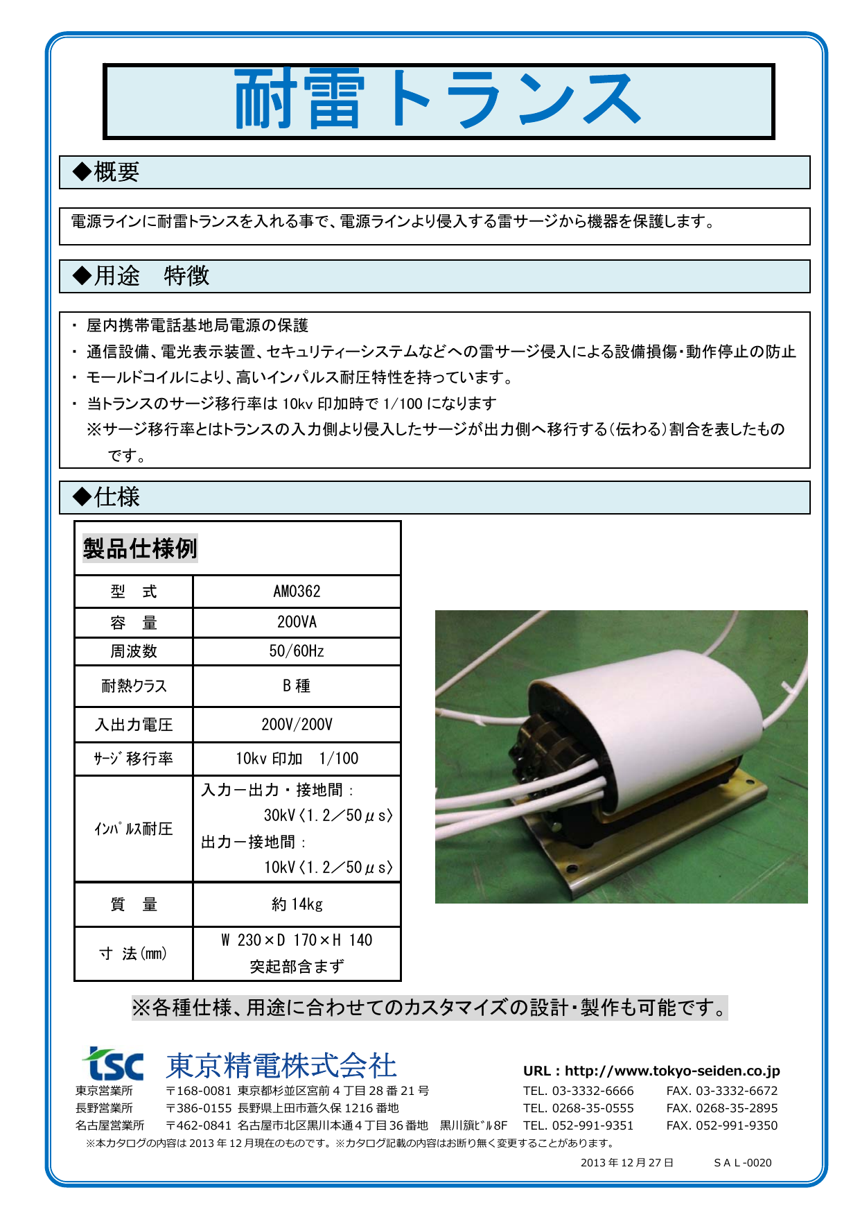 電源ラインに耐雷トランスを入れる事で、電源ラインより侵入する雷サージから機器を保護します。
