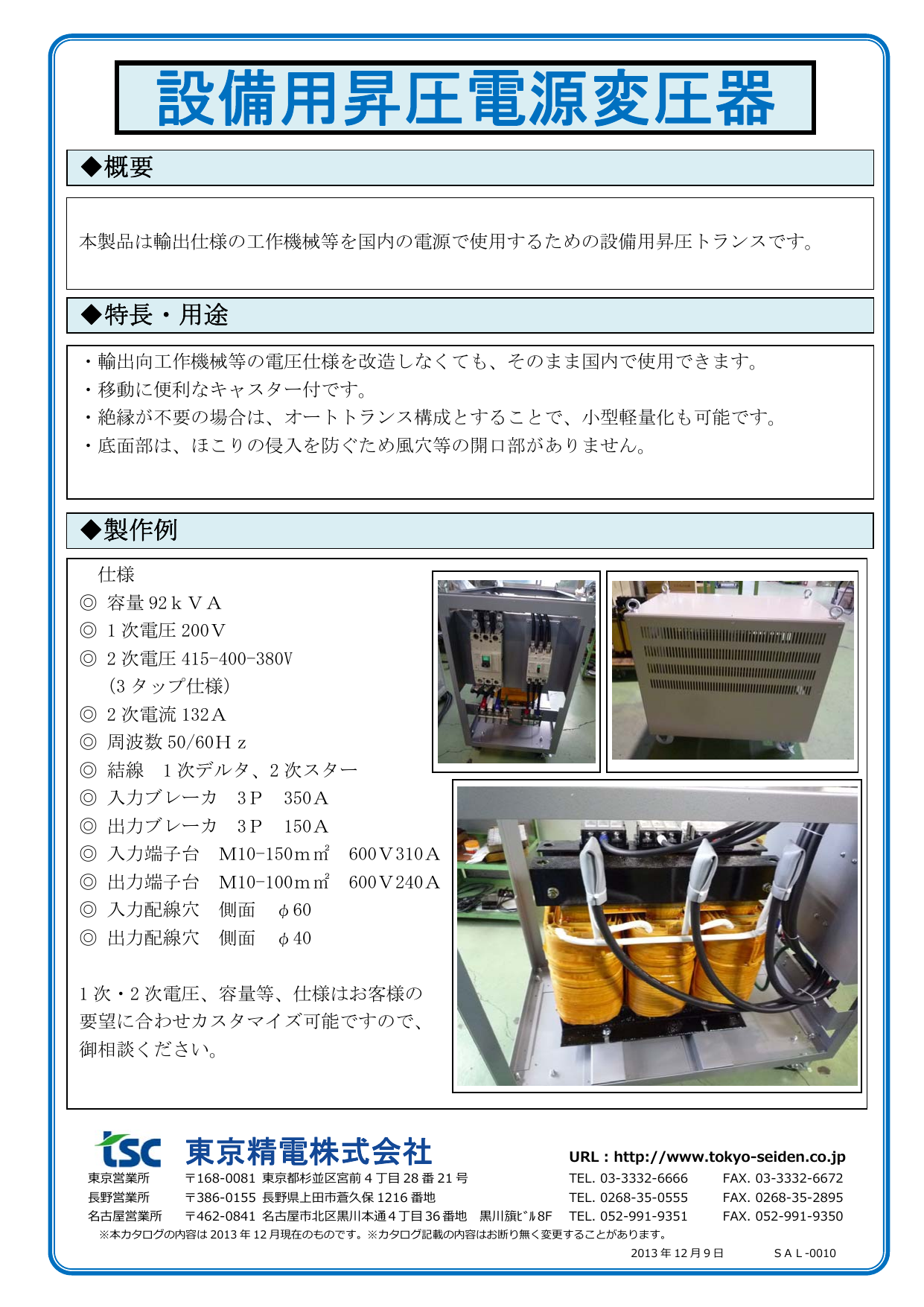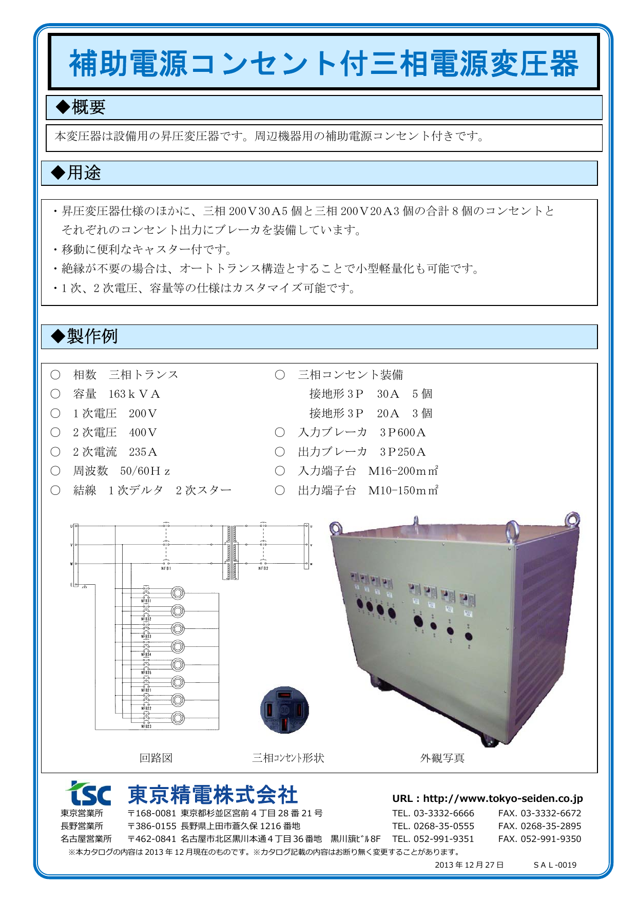 本変圧器は設備用の昇圧変圧器です。周辺機器用の補助電源コンセント付きです。