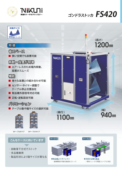 【掲載内容】 ・特長 ・設置イメージ ・主要仕様 ・対応コンテナ、段ボールサイズ ・オプション ・外形寸法図 【特長】 ・省スペース :”超小型”設計のため、狭い空間でも設置可能 ・手軽さを追求 :様々な作業レイアウト...