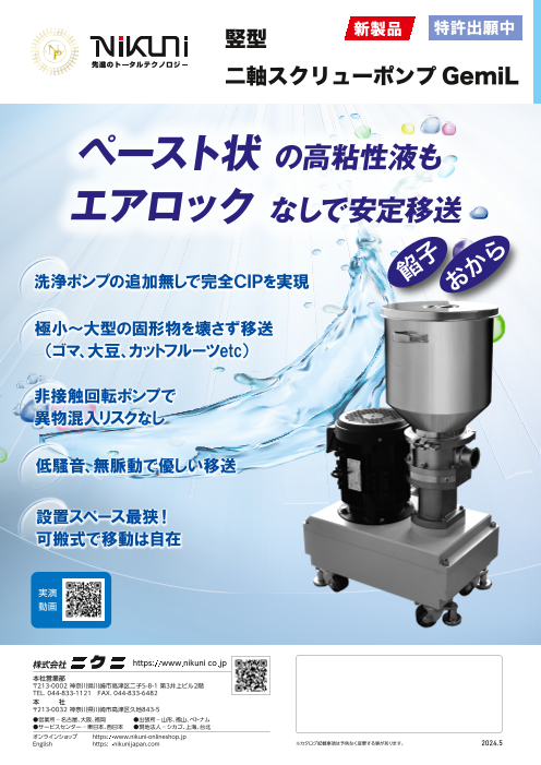 【掲載内容】 ・製品特長 ・動画QR 【製品特長】 ・低粘度~高粘度な液体まで移送が可能 ・低せん断で液質変化が少ない ・微粒子~大型固形物を潰さず壊さず移送が可能 ・非接触回転で摩耗がなく長寿命 【こんな方におすすめ】 ・...