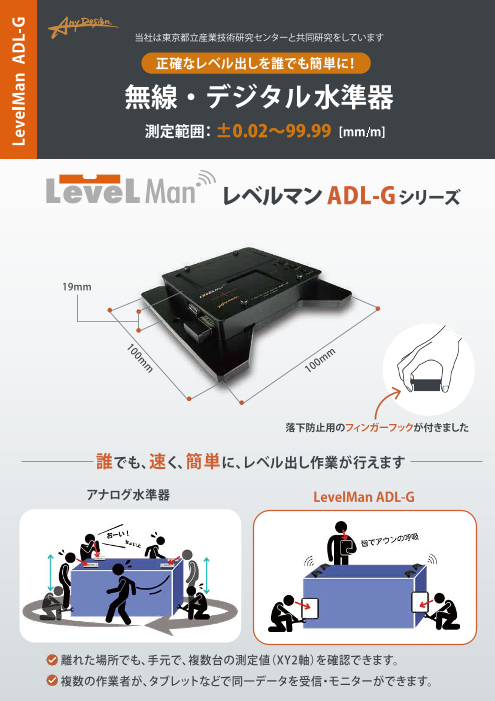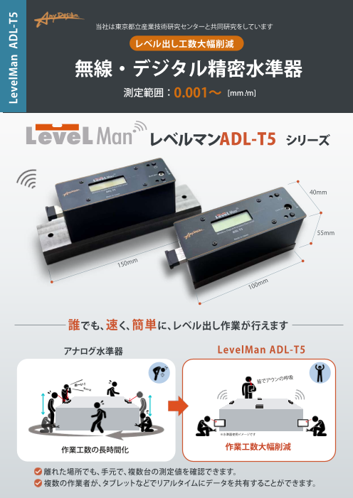 LevelMan(レベルマン)ADL-T5シリーズは、高信頼気泡管を画像センサーで読み取るハンディなデジタル精密水準器です。 無線送信機を搭載しており、同時に多点計測ができます。 複数の作業者が、タブレットなどで同時受信・モニターができ、迅速なレベル...