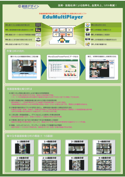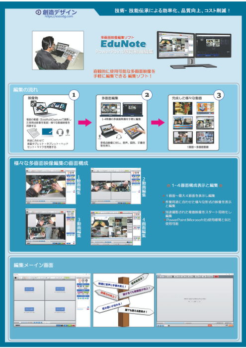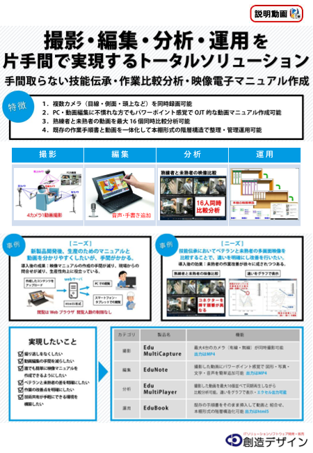 製造業やメンテナンス作業にて手順書だけでは伝わらないカンやコツなどをより分かりやすく伝えるための動画マニュアルが作成可能。初心者の方でも短時間で作成が行える直感的な操作で編集が行えます。 【特徴】 〇弊社ソフト「EduMultiCapture」に...