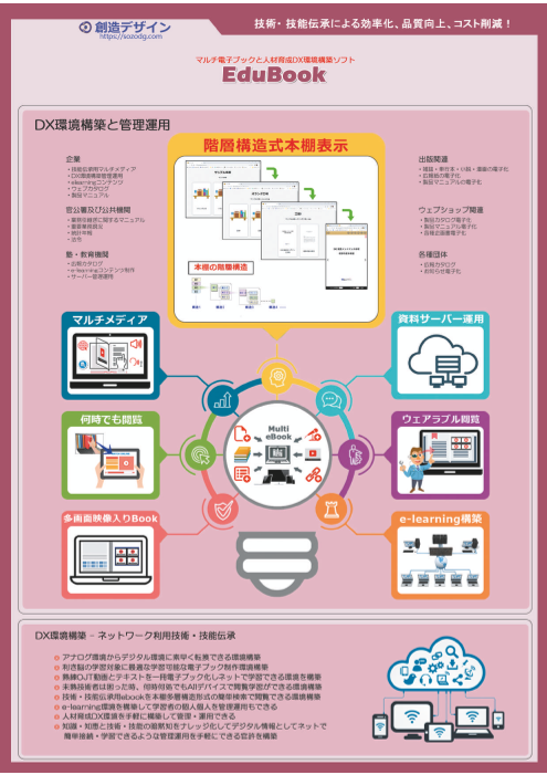 映像電子マニュアル作成・管理運用ツール EduBook 既存の電子ブック機能だけでなくマルチメディア要素(動画像,サウンド,URLリンク)を挿入可能! 誰でも必要な情報をビジュアル的に探しやすい階層構造本棚形式で整理・管理運用可能! 閲覧端末を選ば...