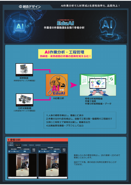「人材育成のDX化」「作業レベルの見える化」を目的とする"作業分析"による改善方法を、 "AI"を用いた手法により分析にかかる時間を大幅に短縮できることができます。 時間と手間をできるたげ減らし、生産性向上に役立てることを"EduAI"によって実現可...