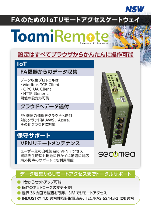 機器に異常が発生しても現地に行かずにVPNリモートメンテナンスができるToamiRemote Powered by Secomeaを使えば、迅速な保守サポートを実現できます。Industry4.0の適合性認証も取得しているので、IoTの用途でも使用するこ...
