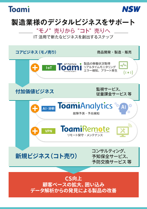 NSWのIoT構築のノウハウとIoTプラットフォーム「Toami(トアミ)」を活用し、マイクロソフトが提供するクラウドプラットフォームMicrosoft Azure上に、より簡単にスピーディにノーコードでIoTサービスを立ち上げられる「Toami Lit...