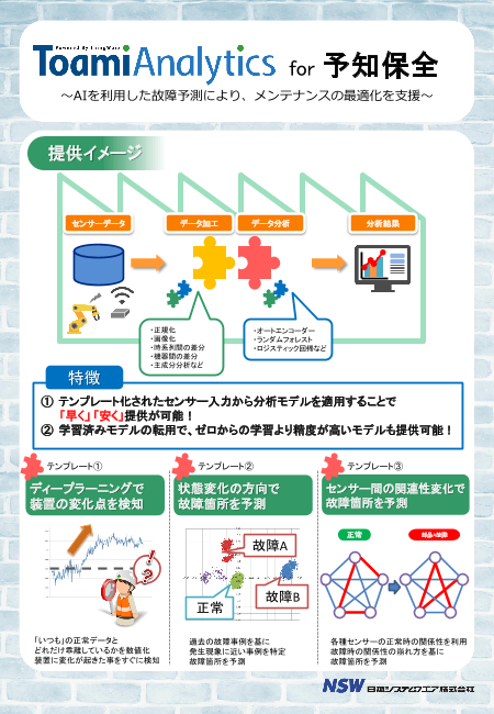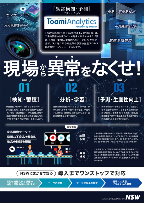Toami Analytics powered by Impulse は現場で収集された、設備や製品の時系列データ・画像データからAI・機械学習を利用し、故障予測、不良品の検出などを行う分析サービスです。 詳細はカタログをご覧ください。