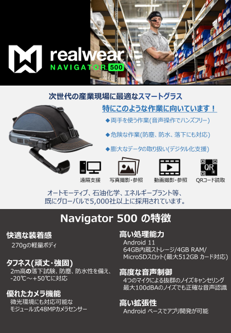 産業用スマートグラス「RealWear」の概要資料です。2020年11月には「Teams on Realwear正式版」がリリースされました。その他の連携可能なソフトウェアのご紹介や、防爆仕様(HMT-1Z1)、オプション一覧等をご覧いただけます。