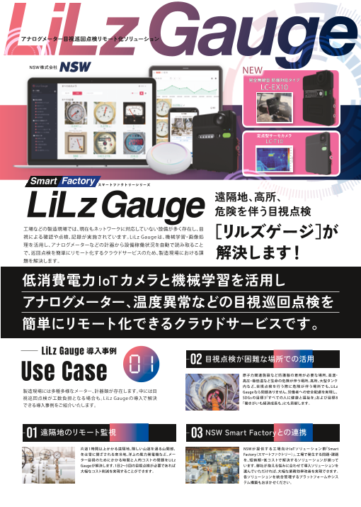 LiLz Gauge(リルズゲージ)は隔地や危険を伴う場所などにある計器の巡回点検を簡単にリモート化でき、事故の発生や人手不足を解決します。 詳細はカタログをご覧ください。