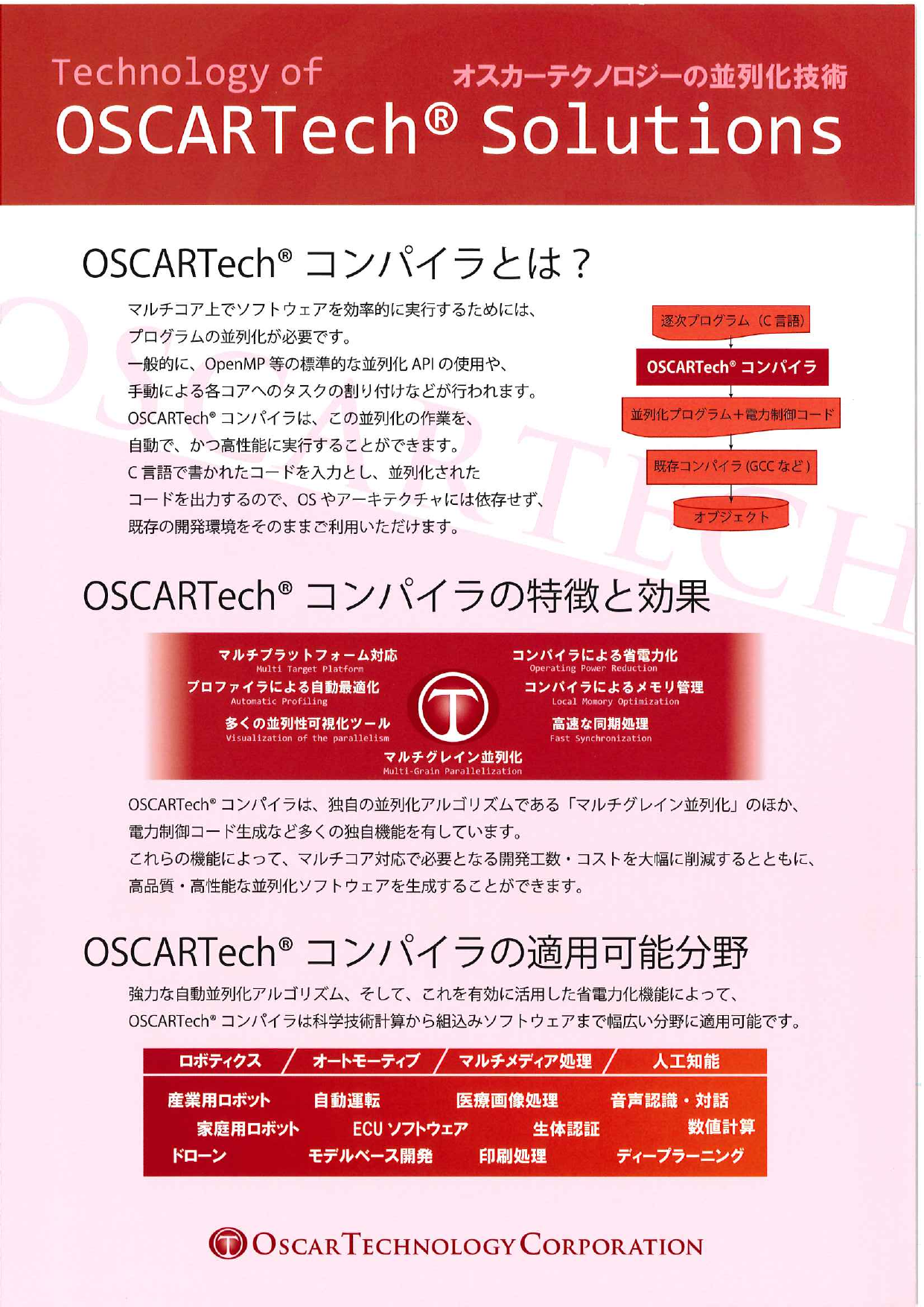 オスカーテクノロジー株式会社は、自動並列化というキーワードのもと、以下の各サービスを提供いたします。 (1)受託並列化サービス 逐次プログラムのソースコードに対して、OSCARTech®コンパイラを用いた自動並列化を適用し、並列化(高速化・省電力...