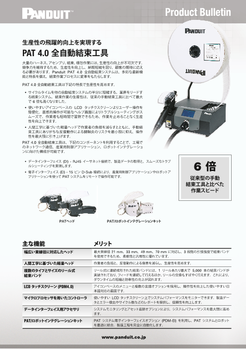 大量のハーネス、アセンブリ、結束、梱包作業には、生産性の向上が不可欠です。競争力を維持するため、生産性を向上し、納期短縮を図り、顧客の期待に応える必要があります。Panduit PAT 4.0 全自動結束システムは、多彩な最新機能と特長を備え、結束作業プ...
