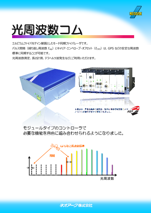 エルビウムファイバをゲイン媒質としたモード同期ファイバレーザです。 パルス間隔(繰り返し周波数frep)とキャリア・エンベロープ・オフセット(fCEO)は、GPSなどの安定な周波数標準に同期することが可能です。 光周波数測定、長さ計測、テラヘルツ波発...
