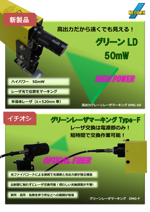 「高出力グリーンレーザマーキング」では、高出力(当社従来比)のLDを搭載することに、より高い視認性を達成することができました。特に距離の離れた場所では従来と比較し高い視認性を得られる可能性が高く、作業効率の改善が期待できます。