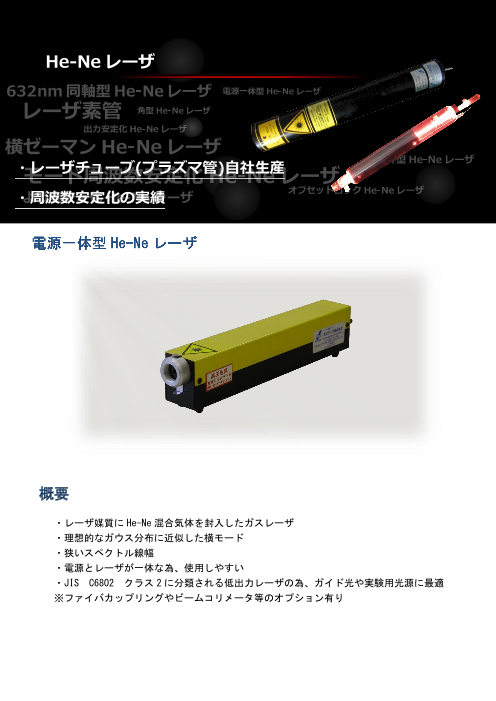 He-Neレーザは、レーザ媒質にHe-Ne混合気体を封入したガスレーザで、可干渉性や空間モードなどの基本性能の高さから、光学実験や高精度位置決め、各種計測分野等で使用されております。 ネオアークでは国内唯一の商業用He-Neレーザメーカとして自社製造を...