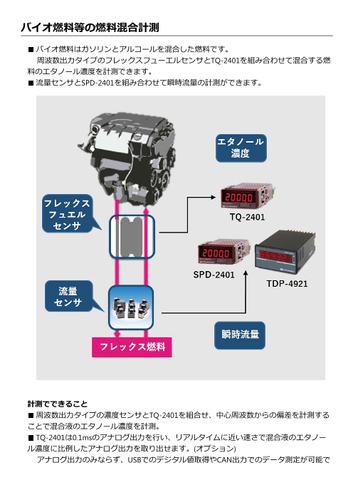 ■ バイオ燃料はガソリンとアルコールを混合した燃料です。 周波数出力タイプのフレックスフューエルセンサと、TQ-2401を組み合わせ 混合燃料のエタノール濃度を計測できます。 ■ 流量センサとSPD-2401を組み合わせ、瞬時または積算流量...
