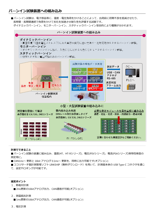 ■ バーンイン試験は、電子部品等に温度・電圧負荷をかけて、出荷前に初期不良を低減させたり、 長時間・長期間連続で負荷をかけて劣化を加速させ耐久性を評価する試験です。 ダイナミックバーンイン、モニターバーンイン、スタティックバーンイン等目的により種...