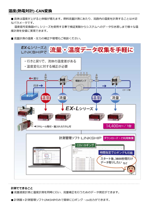 ■ 流体は温度が上がると体積が増えます。燃料流量計測にあたり、流路内の温度を計測することは大切なパラメータです。 温度信号変換器HTLシリーズを使用する事で検証実験からシステムへのデータ引き渡しまで様々な温度計測を安価に実現できます。 ■ 流...