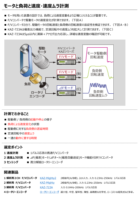 ■ モータを用いた装置を設計する際には負荷による速度変動をより正確にとらえることが重要です。 ■ F/Vコンバータで駆動モータの速度変化が計測できます。 ■ F/Vコンバータ2台で、駆動モータの回転速度と、負荷側の回転速度の追従性を検証できます。 ...