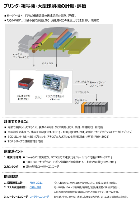 ■モータやベルト、ギアなど伝達装置の伝達誤差の計測、評価に ■たるみや破れ、印刷不良の原因となる、用紙巻取りの速度比などを計測し、制御に 計測でできること ■ 内部で演算し出力するため、複数の回転計などの演算と比べ、高速・高精度で計測可能 ■...