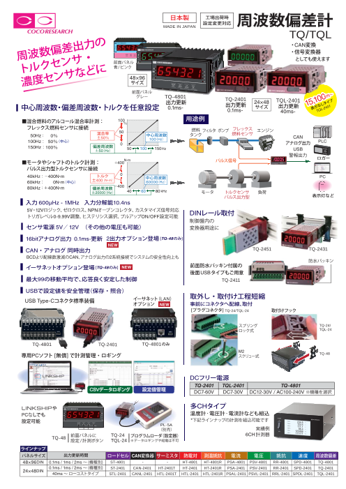 ・偏差周波数信号を出力するトルクセンサや、フレックスフューエルセンサなどに接続。 ・中心周波数、定格トルク、定格周波数を任意設定し、トルク値や燃料濃度を表示します。 ・CAN出力(1ms更新)、16bitアナログ出力(0.1ms更新)、アラーム出力な...