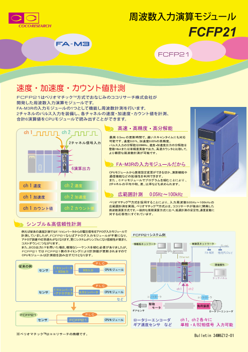 ペリオマチックTM方式でおなじみのココリサーチ株式会社が開発した、 横河電機㈱のパートナーシップの周波数入力演算モジュール。 横河電機社製PLCのFA-M3Rの入力モジュールの1つとして機能し周波数計測を行います。 2チャネルのパルス入力を装...
