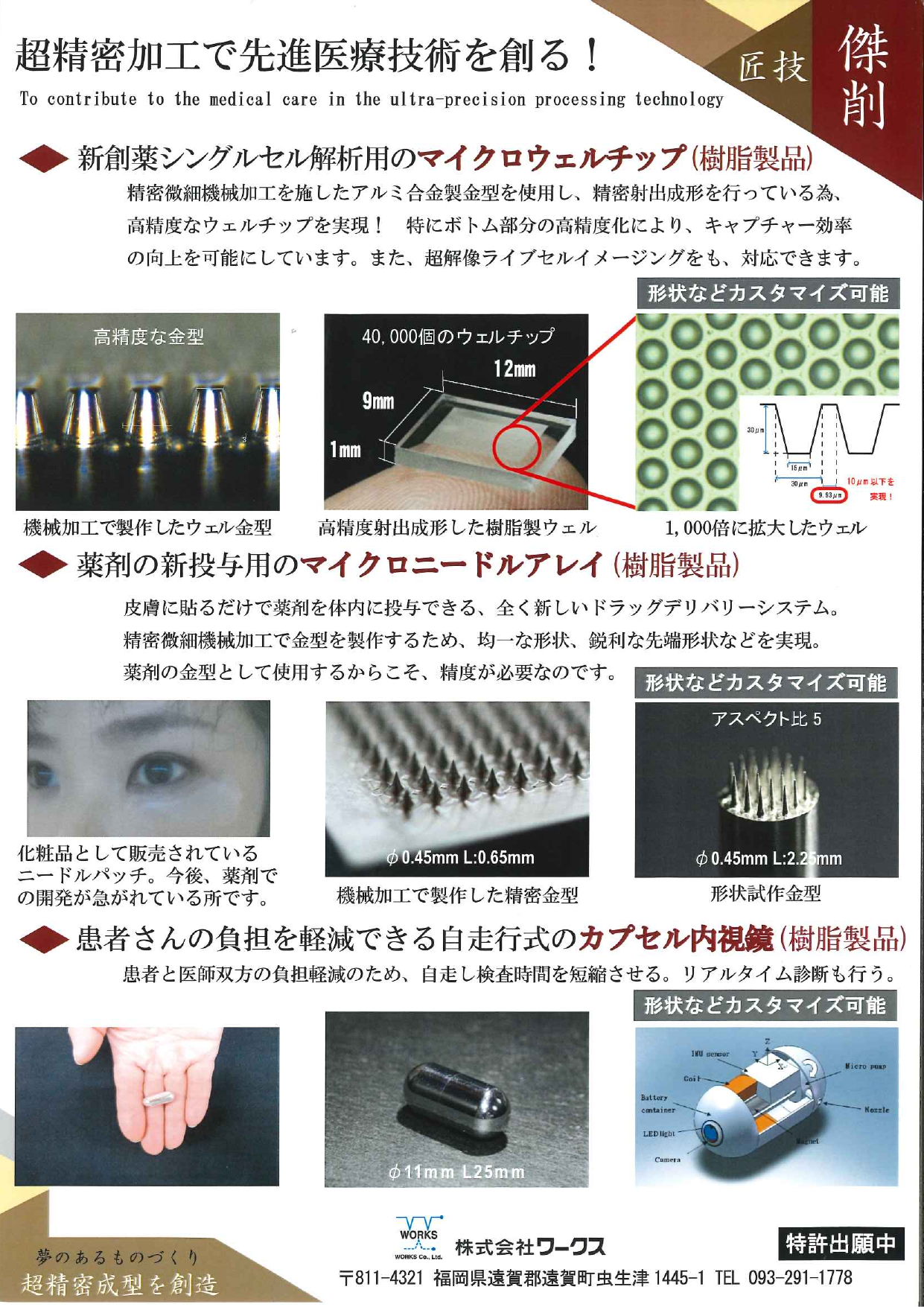 ・新創薬シングルセル解析用のマイクロウェルチップ(樹脂製品) ・薬剤の新投与用のマイクロニードルアレイ(樹脂製品) ・患者さんの負担を軽減できる自走行式のカプセル内視鏡(樹脂製品)