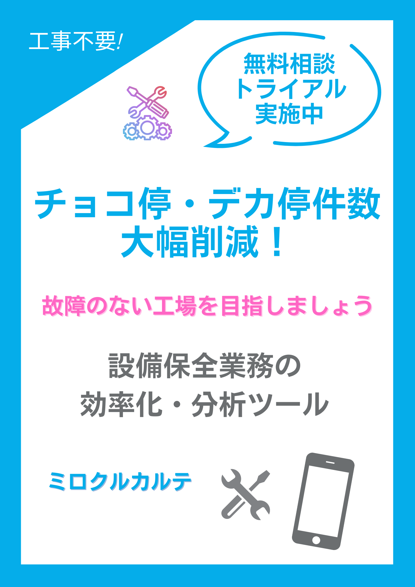 <ミロクルカルテはこんな現場におすすめ> ・紙やエクセルのバケツリレーに限界を感じている ・設備保全業務を効率化して、工場全体の生産性を向上したい ・大きな設備保全システムでは規模が合わない その悩み 設備の修理状況の見える化・分析ツール ミ...
